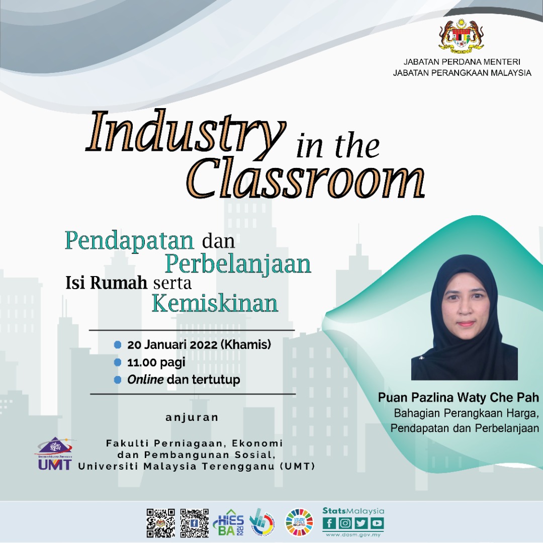 Pihak DOSM telah dijemput untuk membentangkan topik berkaitan 'Pendapatan dan Perbelanjaan Isi Rumah serta Kemiskinan' dalam forum 'Industry in the Classroom' anjuran Fakulti Perniagaan, Ekonomi dan Pembangunan Sosial, Universiti Malaysia Terengganu (UMT) yang disampaikan oleh Puan Pazlina Waty Che Pah, Bahagian Perangkaan Harga, Pendapatan dan Perbelanjaan (BPHPP) pada jam 11.00 pagi tadi secara dalam talian.