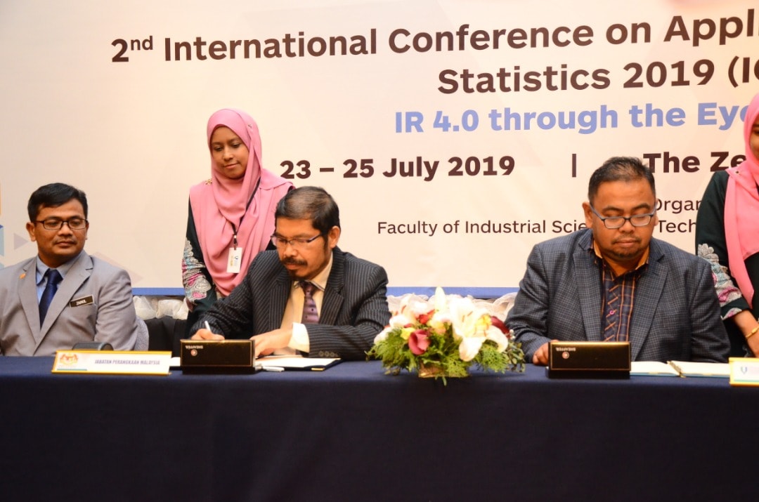 The Department of Statistics Malaysia (DOSM) and Universiti Malaysia Pahang (UMP) has established a strategic partnership with a memorandum of understanding (MoU) to generate new relevant knowledge through academic research activities. A signing ceremony of the Memorandum of Understanding (MoU) between the Department of Statistics Malaysia and Universiti Malaysia Pahang was held on 23th July 2019 at Zenith Hotel, Kuantan, Pahang. The ceremony was officiated by the Chief Statistician Malaysia, YBhg. Dato’ Sri Dr. Mohd Uzir Mahidin and UMP Deputy Vice-Chancellor, YBhg. Professor Dr. Kamal Zuhairi bin Zamli and witnessed by senior officers of the two agencies.