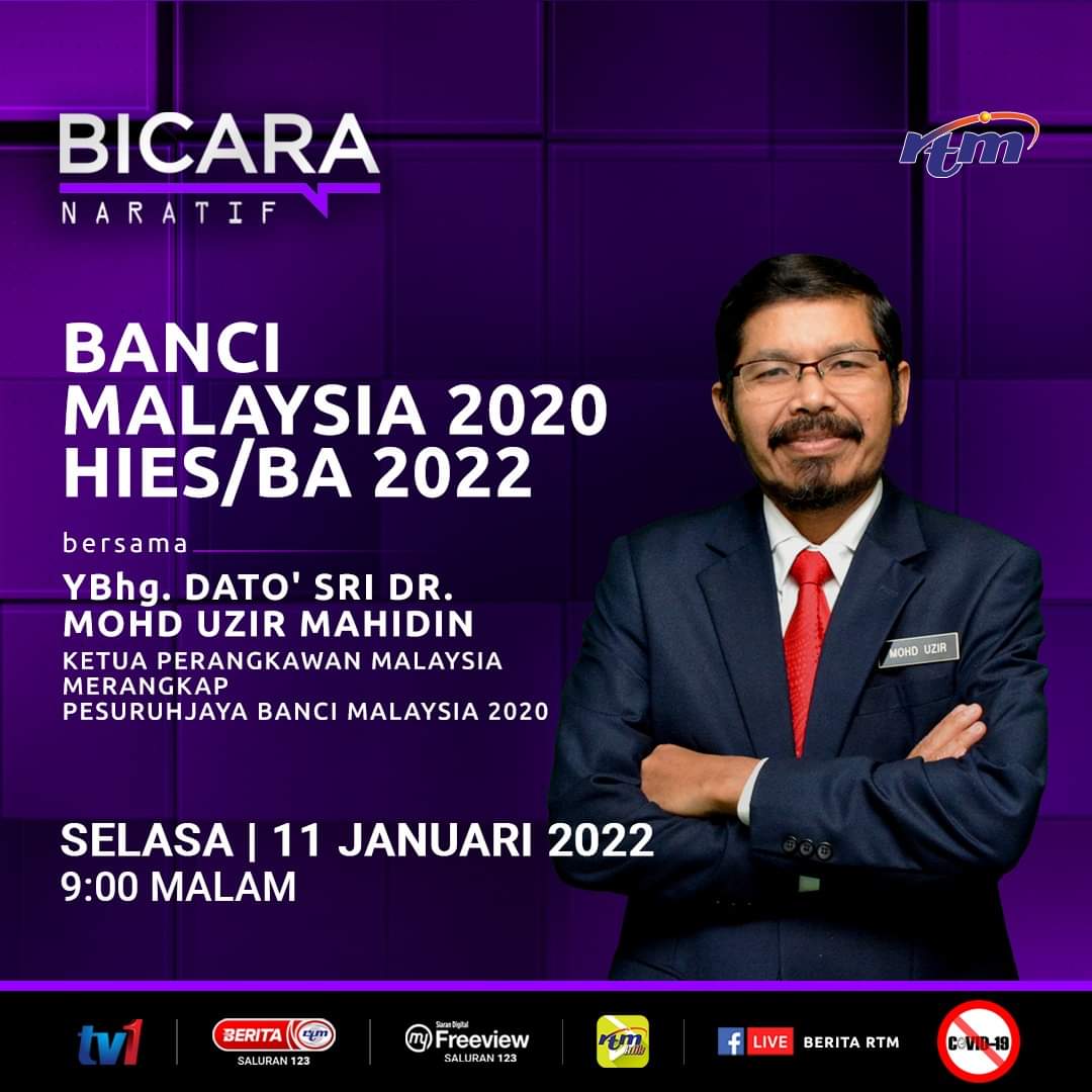 Bicara Naratif titled ‘Malaysia 2020 HIES/BA 2022' by the Chief Statistician Malaysia cum Census Commissioner of the Malaysia 2020 Census, YBhg. Dato ’Sri Dr, Mohd Uzir Mahidin on TV1 Radio Televisyen Malaysia (RTM), on 11 January 2022 (Tuesday) at 9.00 pm