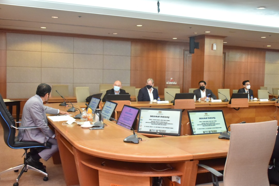 Kunjungan Hormat daripada YBrs Tuan Adam Ling Hua Yong, Social Policy Specialist, United Nations Children's Fund (UNICEF) dan delegasi kepada YBhg. Dato’ Sri Dr. Mohd Uzir Mahidin, Ketua Perangkawan Malaysia pada 21 Julai 2022 bagi membincangkan dapatan projek Monitoring and Evaluation (M&E) di Malaysia dan cadangan penambahbaikan selaras dengan Matlamat Pembangunan Mampan (SDG).