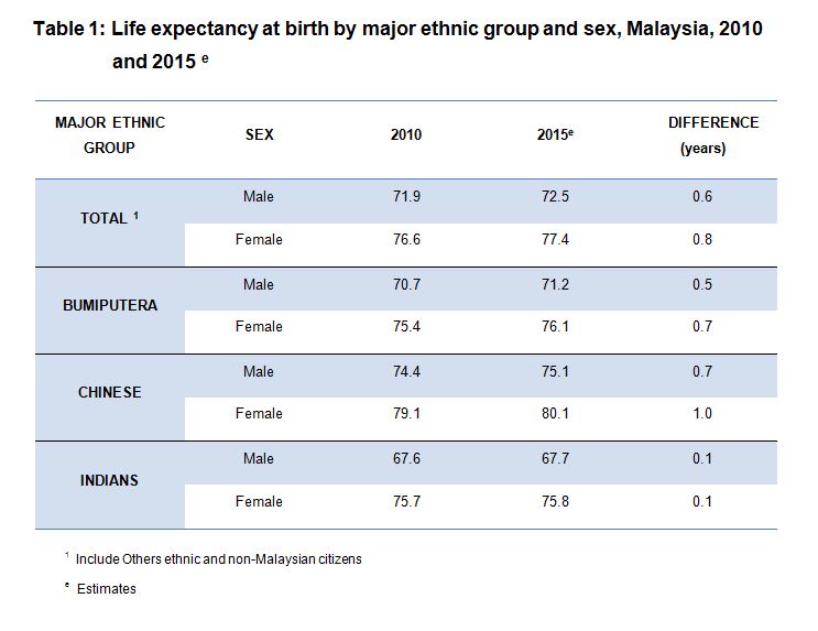 Life expectancy at birth of Malaysian residents continued to rise every year. In 2015, a newborn is expected to live to 74.8 years, increased by 0.7 years as compared to 74.1 years in 2010.