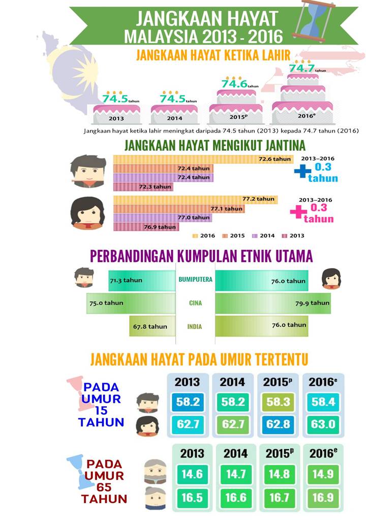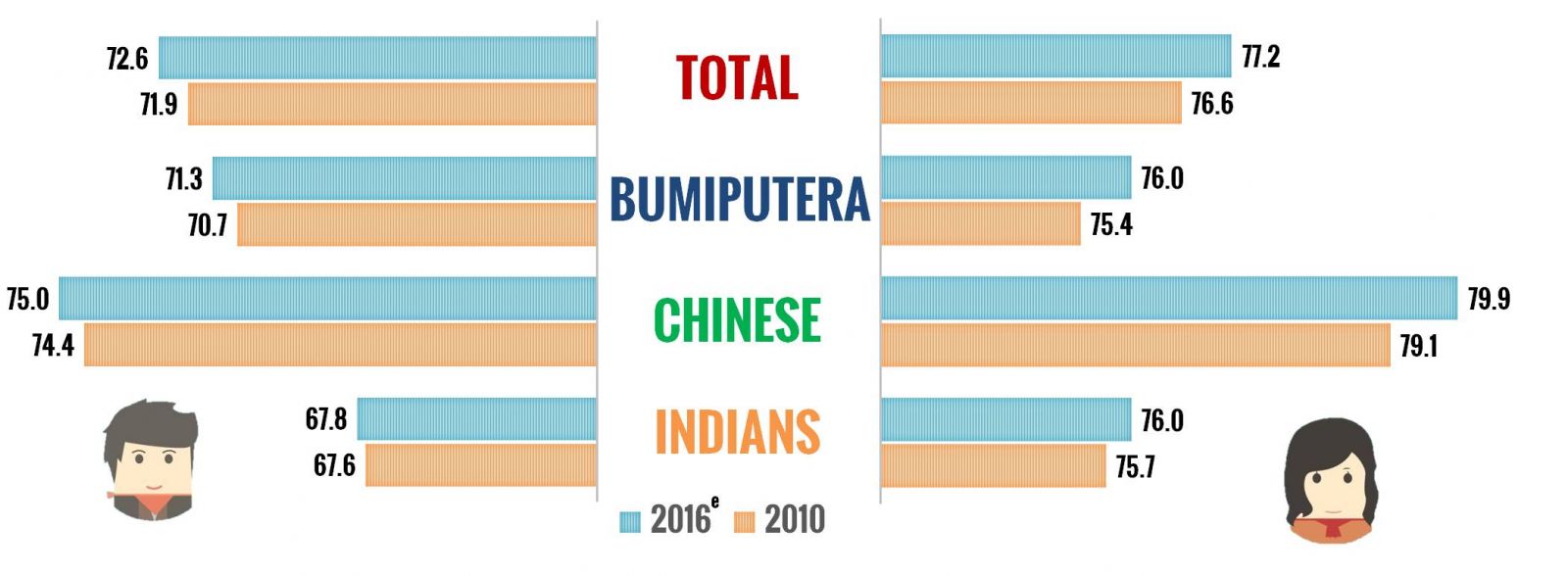 All ethnic groups recorded an increase for life expectancy at birth for the period of 2010–2016. Ethnic with the highest life expectancy among major ethnic groups in Malaysia is Chinese with 77.3 years, followed by Bumiputera (73.6 years) and Indians (71.8 years). The highest life expectancy was Chinese with 75.0 years (male) and 79.9 years (female). The lowest life expectancy by sex was Indians with 67.8 years (male) and 76.0 years (female).