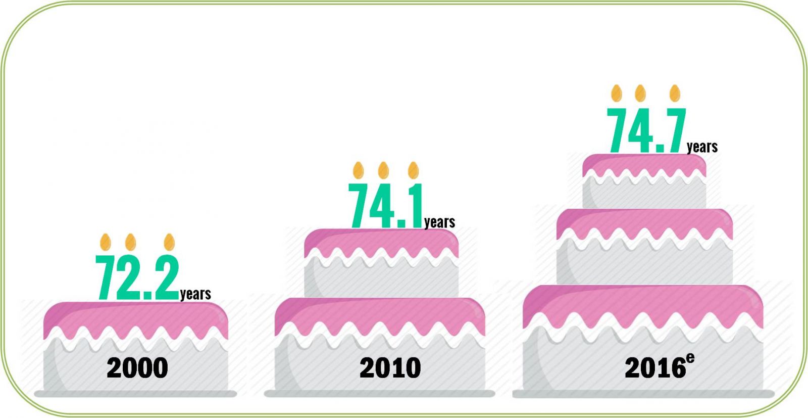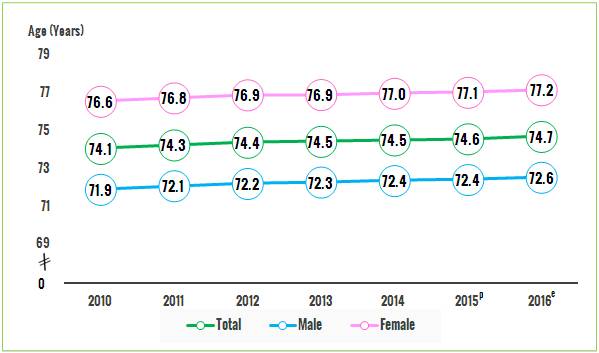In 2016, a newborn baby boy could expect to live 72.6 years and a newborn baby girl to live 77.2 years. Male life expectancy increased by 0.7 years, from 71.9 years in 2010, meanwhile female life expectancy increased by 0.6 years, from 76.6 years for the same period.