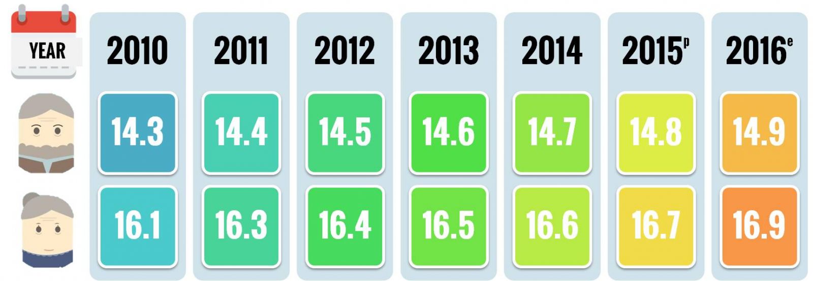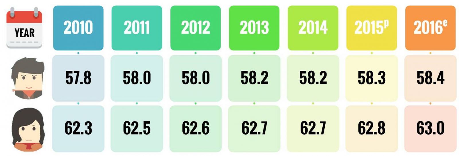 The difference between male and female life expectancy at age 15 years has remain fairly steadily over the years with around 4.5 years and 4.6 years. The gain in life expectancy at age 15 over the period of 2010–2016 was 0.6 years for male and 0.7 years for female.