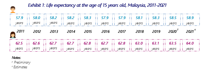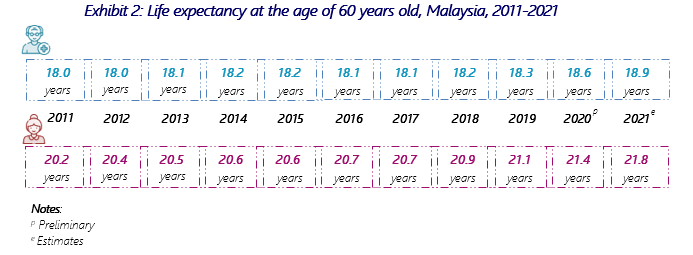 Males and females who reach the age of 60 years old are expected to live further 18.9 years and 21.8 years respectively. Thus, males aged 60 years are expected to live until the age of 78.9 years old and females, 81.8 years old. The gaps for males and female’s life expectancy at the age of 60 years old are between 2.2 to 2.9 years for the period of 2011 till 2021.