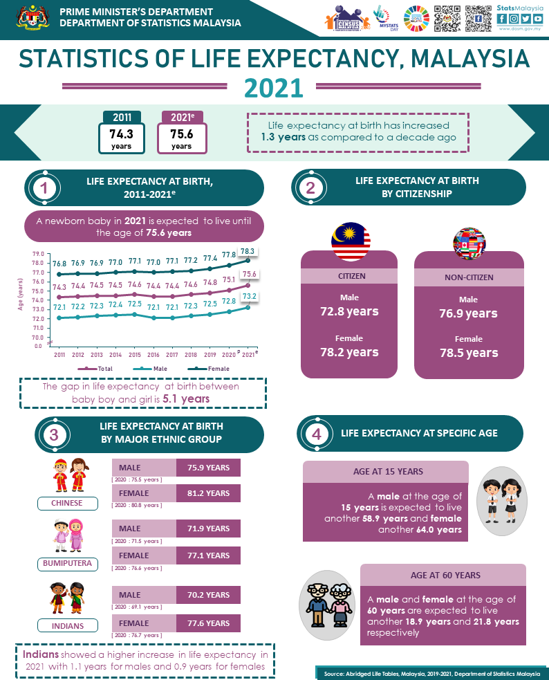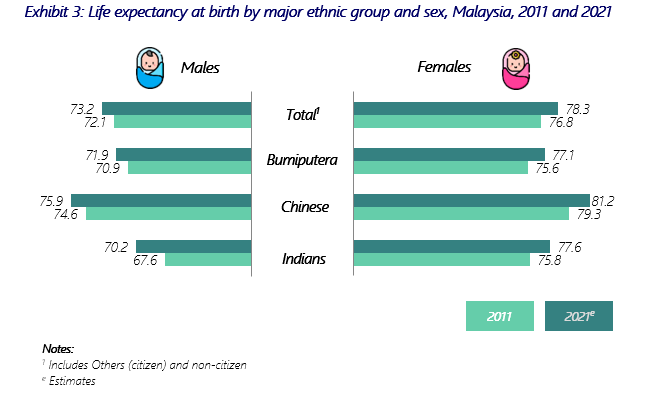 The highest life expectancy at birth by major ethnic group was recorded by Chinese with 81.2 years old females and males with 75.9 years old. In contrast, the lowest life expectancy at birth for males was recorded by Indians with 70.2 years old meanwhile for females was recorded by Bumiputera with 77.1 years old.