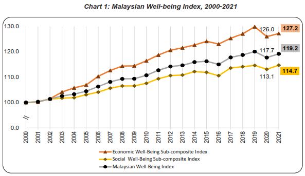 For the period of 2000 to 2021, the economic well-being sub-composite index rose by 27.2 index points. The social well-being sub-composite index also increased by 14.7 index points. Overall, MyWI increased by 19.2 index points over the past 21 years.