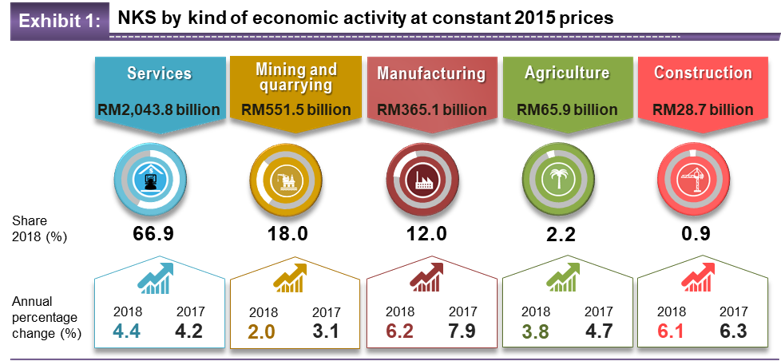 NKS continued to grow at a moderate pace of 4.2 per cent in 2018 compared to 4.5 per cent in 2017. The growth was contributed by Services, Manufacturing and Mining & quarrying sectors. The value of fixed assets in Services sector was the largest compared to other economic activities with a value of RM2.0 trillion and registered a share of 66.9 per cent. Mining and quarrying sector accounted for 18.0 per cent, while Manufacturing sector was 12.0 per cent (Exhibit 1).