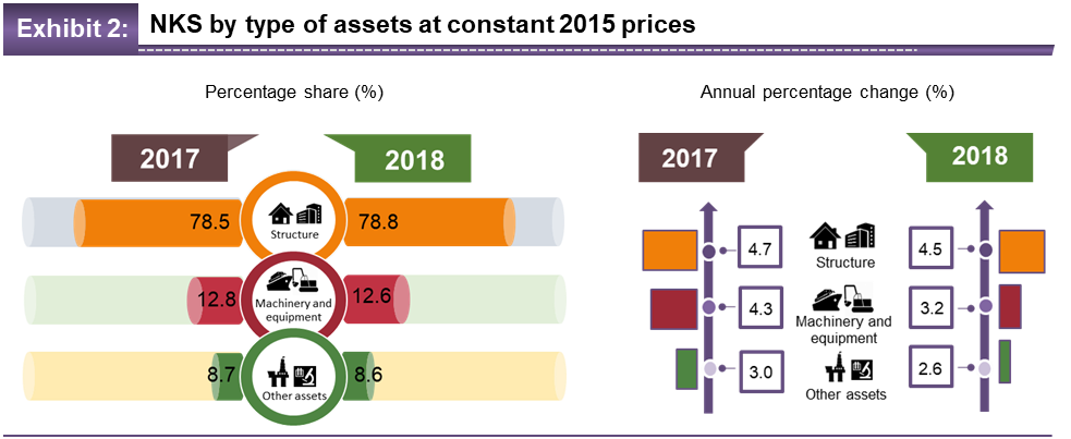 Structure remained as the largest contributor to NKS with a share of 78.8 per cent supported by expenditure on non-residential and other structure. Machinery and equipment was the second largest contributor with 12.6 per cent. In terms of growth, Structure registered a slower pace of growth with 4.5 per cent while Machinery & equipment and Other assets registered 3.2 per cent and 2.6 per cent respectively (Exhibit 2).