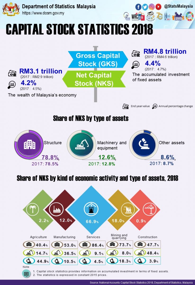 Capital stock statistics for year 2015 to 2018 has been realigned with the rebasing of Gross Domestic Product to year 2015. In 2018, Gross Capital Stock posted a value of RM4.8 trillion with a growth of 4.4 per cent. Net Capital Stock (NKS) which portrays the wealth of Malaysia’s economy increased 4.2 per cent to attain RM3.1 trillion.