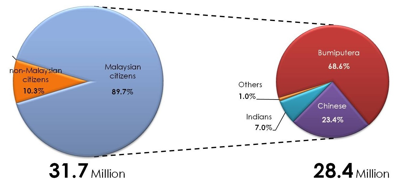 Among Malaysian citizens, ethnic Bumiputera recorded the highest percentage with 68.6 per cent, followed by Chinese (23.4 %), Indians (7.0 %) and Others (1.0 %). The percentage of non-Malaysian citizen in 2016 was at 10.3 per cent out of total population in Malaysia.