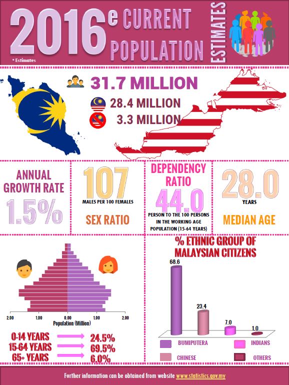In 2016, total population of Malaysia is estimated at 31.7 million persons, an increase of 0.5 million persons as compared to 31.2 million persons in 2015 with 1.5 per cent population growth rate for the same period.