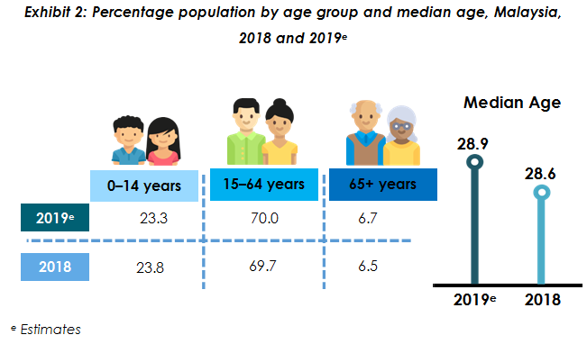 The increase in the composition of working age and the old age population contributed to the incline of the median age in 2019. The median age rose to 28.9 years from 28.6 years in 2018.