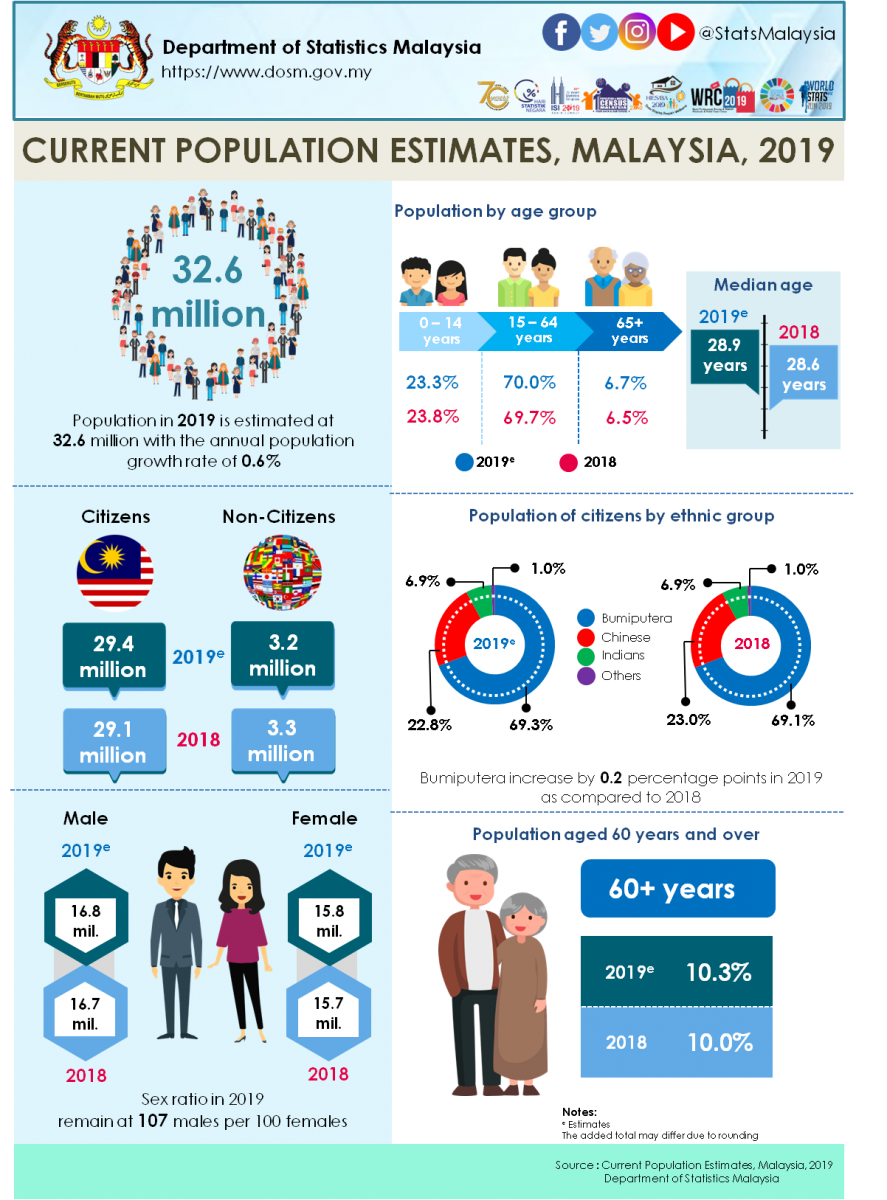 The Current Population Estimates, Malaysia, 2019 presents mid-year population estimates of Malaysia and state for the year 2018–2019. The population estimates provided are based on Population and Housing Census 2010 which has taken into accounts births, deaths and migration components.