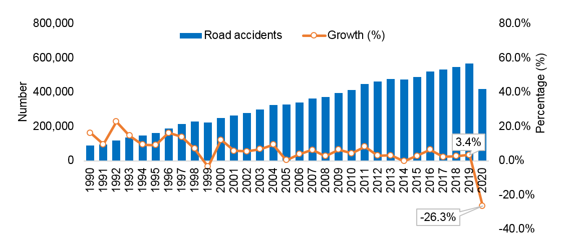 Number of road accidents and growth rate, Malaysia, 2016-2020