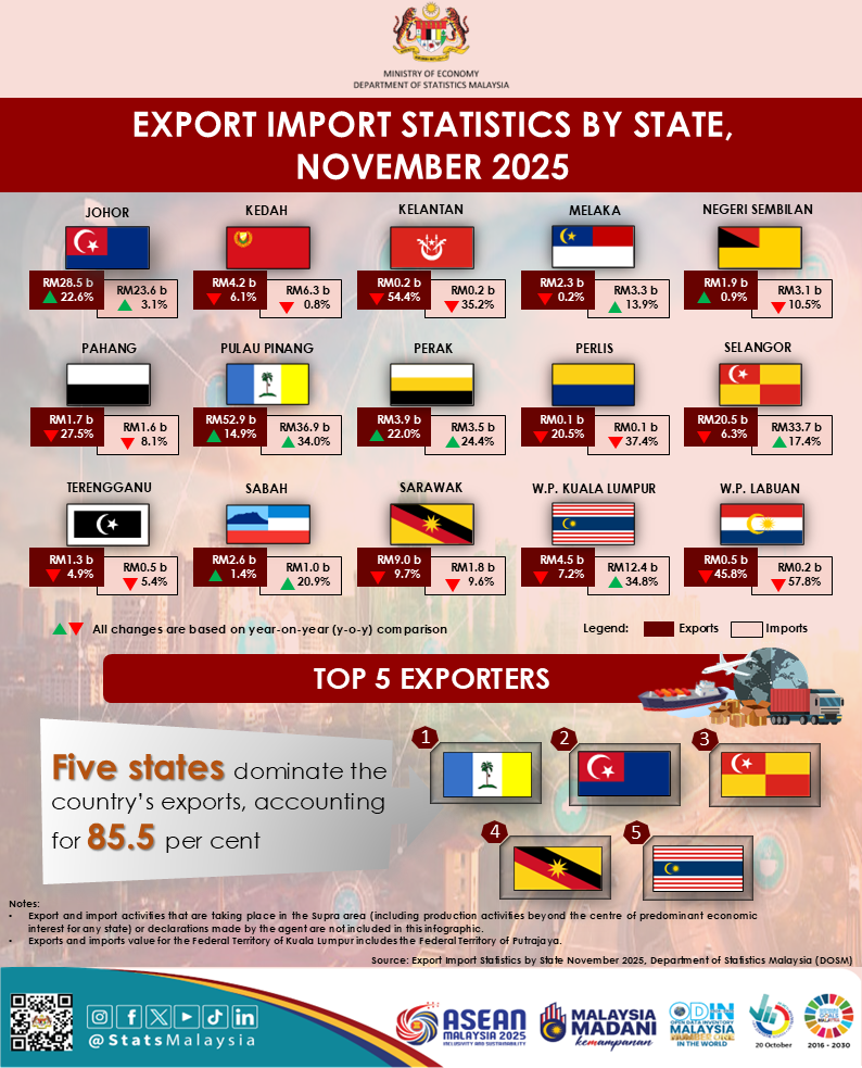 - At the same time, imports in November 2025 increased RM17.6 billion (+15.8%) as compared to the same month in year 2024. The increase in imports was attributed by the higher imports in Pulau Pinang (+RM9.4 billion), Selangor (+RM5.0 billion), W.P. Kuala Lumpur (+3.2 billion), Johor (+RM707.8 million), Perak (+RM681.3 million), Melaka (+RM398.3 million)and Sabah (+RM165.2 million). However, imports decreased in Negeri Sembilan RM368.3 million, W.P. Labuan (-RM266.8 million), Sarawak (-RM193.7 million), Pahang (-RM140.7 million), Kelantan (-RM91.3 million), Perlis (-RM57.4 million), Kedah (-RM48.6 million) and Terengganu (-RM27.3 million).