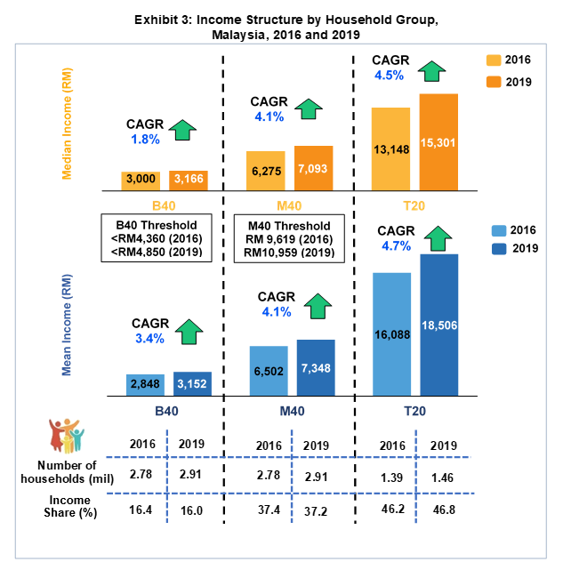 In 2019, mean income in Malaysia was RM7,901 while Malaysia’s median income recorded at RM5,873. In terms of growth, median income in Malaysia grew by 3.9 per cent per year in 2019 as compared to 6.6 per cent in 2016. Moreover, mean income rose at 4.2 per cent in 2019.