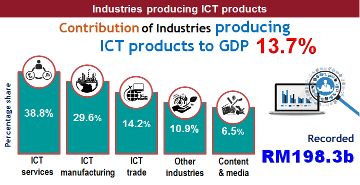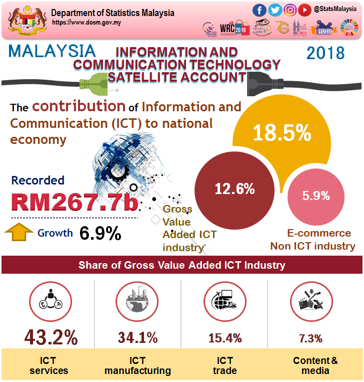 For the year 2018, Gross Value Added of ICT industry increased to RM182.4 billion registered a growth of 6.1 per cent. ICT services industry dominated with a share of 43.2 per cent followed by ICT manufacturing 34.1 per cent.