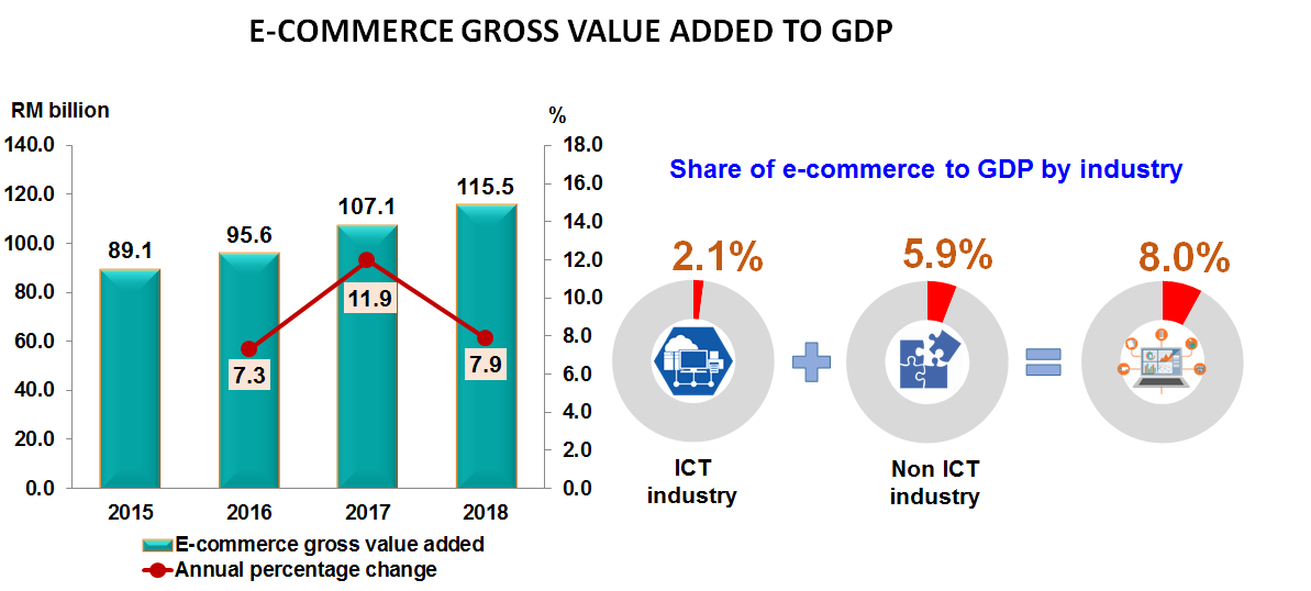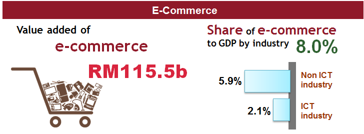 Value added of e-commerce increased to RM115.5 billion grew at 7.9 per cent as compared to 11.9 per cent in 2017. The contribution of e-commerce to GDP recorded 8.0 per cent comprises of e-commerce for non ICT industry 5.9 per cent and e-commerce for ICT industry 2.1 per cent.