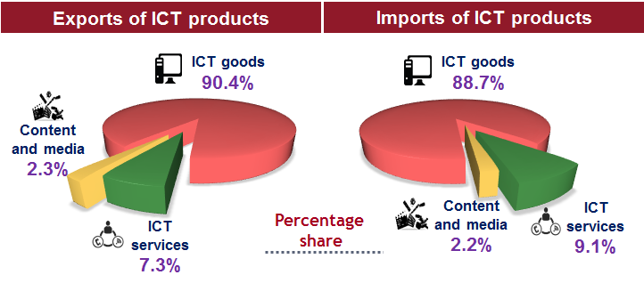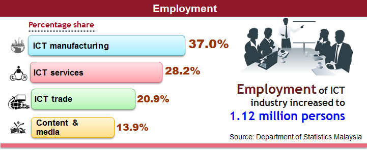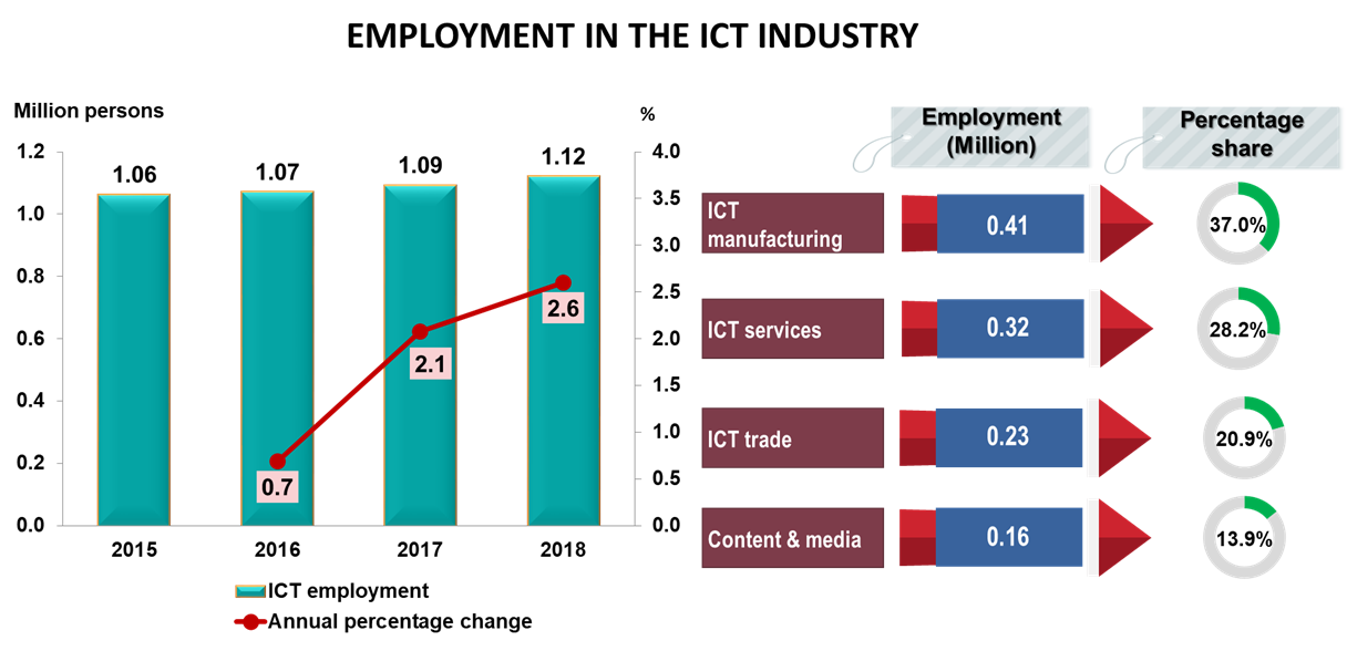 Employment in the ICT industry increased to 1.12 million persons with a growth of 2.6 per cent as compared to 1.09 million persons in 2017. ICT manufacturing industry dominated 37.0 per cent, followed by ICT services (28.2%) and ICT trade (20.9%).
