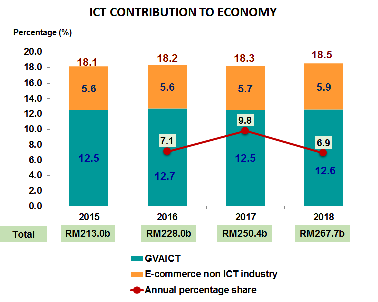 Contribution of Information and Communication Technology (ICT) to the national economy continued to expand in 2018 by 18.5 per cent as compared to 18.3 per cent in the previous year. Gross Value Added of ICT industry (GVAICT) contributed 12.6 per cent while e-commerce non ICT industry 5.9 percent.