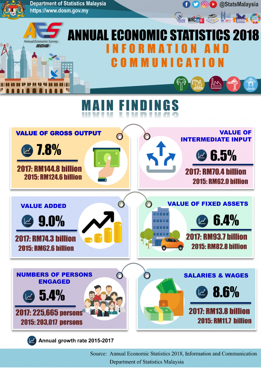 The information and communication services recorded gross output value of RM144.8 billion in 2017 compared to RM124.6 billion in 2015 with the annual growth rate value of 7.8 per cent per annum. In line with the rapid growth in gross output, the value of intermediate input also increased by RM8.4 billion to record RM70.4 billion with the average annual growth rate of 6.5 per cent, thus resulting a value added of RM74.3 billion for the year 2017.
