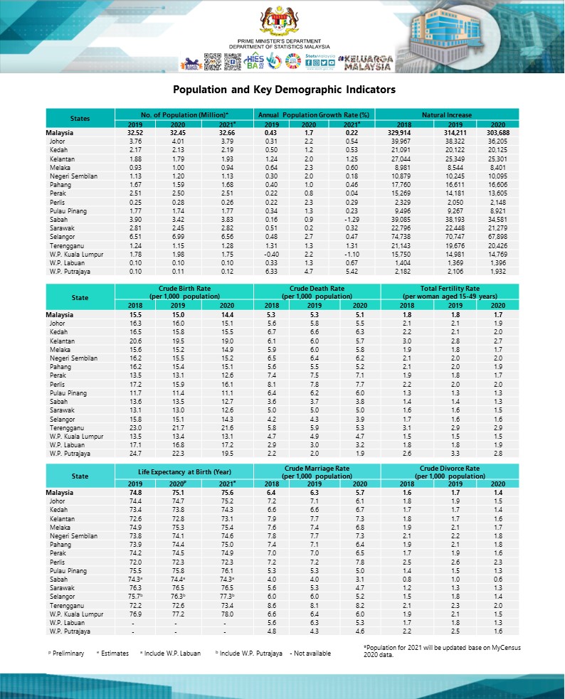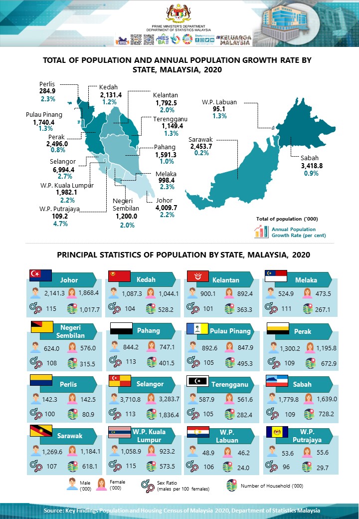 MyCensus 2020 comprises 108 questions is a high-impact investment to the nation (RM413.9 million) produces new National baseline data on social, economic and environmental statistical dimensions. Meanwhile, the main demographics obtained from the MyCensus 2020 include population, households, living quarters, sex, age, citizenship, ethnicity, religion and marital status. More than 1,000 MyCensus 2020 reports covering 16 states, 160 administrative districts, 222 parliaments and 600 state legislative assemblies will be published in stages from February 2022 to 2024.