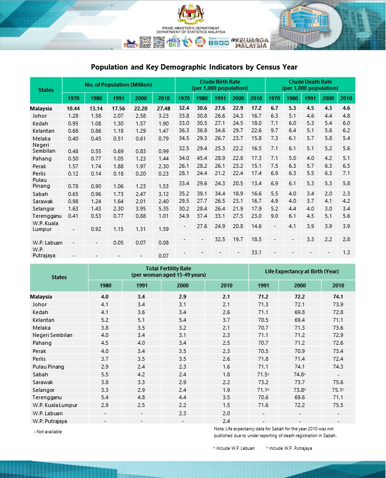 The highest young age population composition (0-14 years) by state was in W.P. Putrajaya (38.0%), Kelantan (30.0%) and Terengganu (28.6%). The composition of the working age population (15-64 years) was the highest in W.P. Kuala Lumpur (73.5%), Penang (73.3%) and Perlis (71.7%). The composition of the elderly population (65 years and over) was the highest in Perak (8.9%), Perlis and Kedah (7.9%) and Sarawak (7.5%). The oldest resident recorded was 120 years old male citizen and lives in Mersing, Johor.