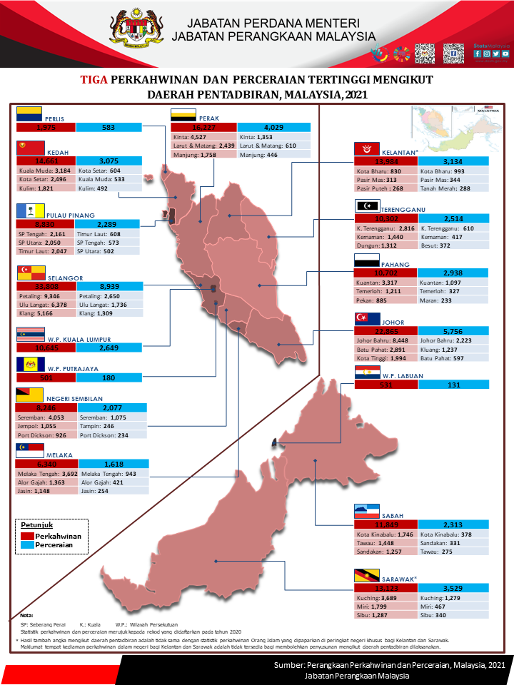The full publication of the Marriage And Divorce, Malaysia, 2021 can be downloaded from eStatistik portal.
