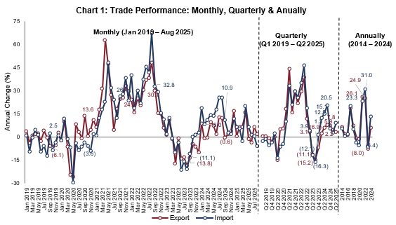 Exports, imports, total trade and trade surplus from January to August 2025 increased by 3.9 per cent, 3.6 per cent, 3.8 per cent and 7.4 per cent respectively compared to the same period the previous year.