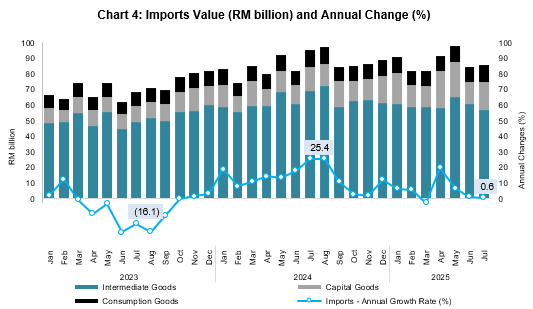 Malaysia’s import value rose by 0.6 per cent or RM753.5 million to RM125.5 billion in July 2025. However, on a month-on-month basis, imports surged by 10.9 per cent or RM12.3 billion. Based on seasonally adjusted month-on-month terms, imports recorded an increase of 8.6 per cent to RM120.7 billion.