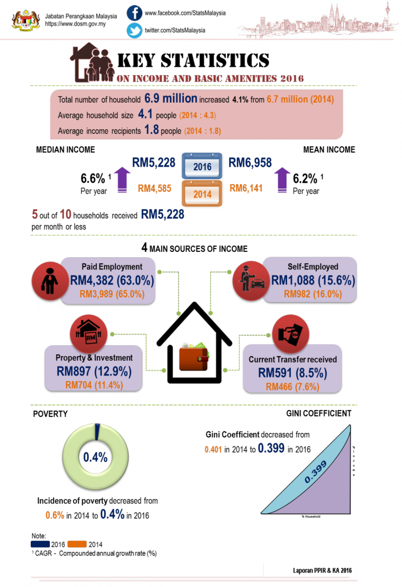 The overall incidence of poverty has improved from 0.6 per cent in 2014 to 0.4 per cent in 2016. Similarly, poverty incidence in the urban and rural areas depicted the same trend whereby it decreased to 0.2 per cent and 1.0 per cent respectively. Incidence of poverty in all states have declined with the most significant improvement was Sabah from 4.0 per cent in 2014 to 2.9 per cent in 2016.