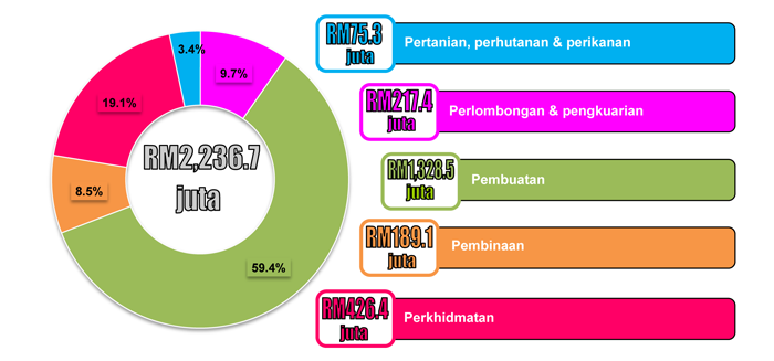 In 2013, a total of RM2,236.7 million was spent for environmental protection. The manufacturing sector was the highest contributor for environmental protection expenditure amounting to RM1,328.5 million (59.4%) while the agriculture, forestry & fishing sector recorded the lowest at RM75.3 million (3.4%).