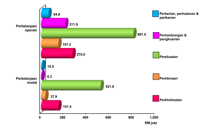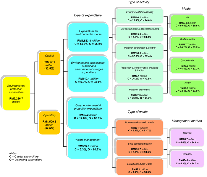 Capital and operating expenditure each represents 32.5 per cent (RM727.1 million) and 67.5 per cent (RM1,509.5 million) of the total environmental protection expenditures. The manufacturing sector was the largest contributor to both the expenditure of RM521.0 million (71.7%) of the capital and RM807.5 million (53.5%) for the operating, followed by services RM151.4 million (20.8%) and RM275.0 million (18.2 %).