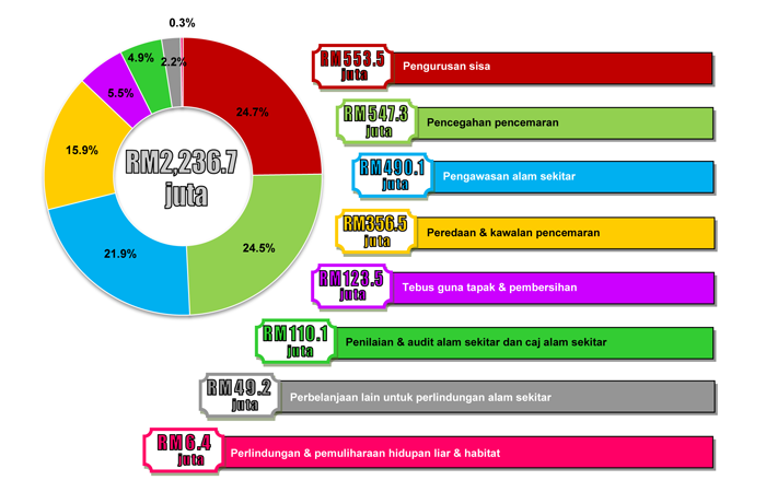 The expenditure for waste management was the highest at RM553.5 million (24.7%) followed by pollution prevention expenditure RM547.3 million (24.5%),environmental monitoring RM490.1 million (21.9%) and pollution abatement & control RM356.5 million (15.9%). The remainder was the other expenditures at RM289.2 million (12.9%).