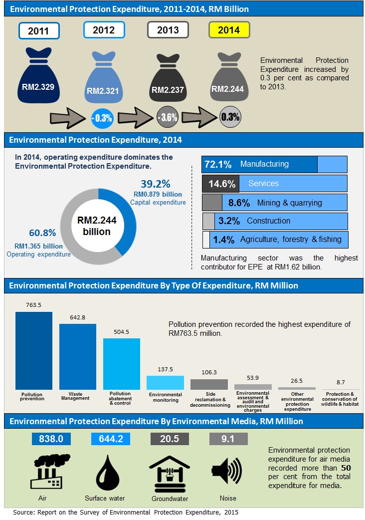 The Report on The Survey of Environmental Protection Expenditure 2015 presents the statistics on the environmental protection expenditure for the reference year 2014. The agriculture, forestry & fishing; mining & quarrying; manufacturing; construction and services sectors are those covered in this survey. The selected establishments in this survey using a single stage stratified random sampling method for gathering information on operating and capital expenditure incurred to protect the environment.