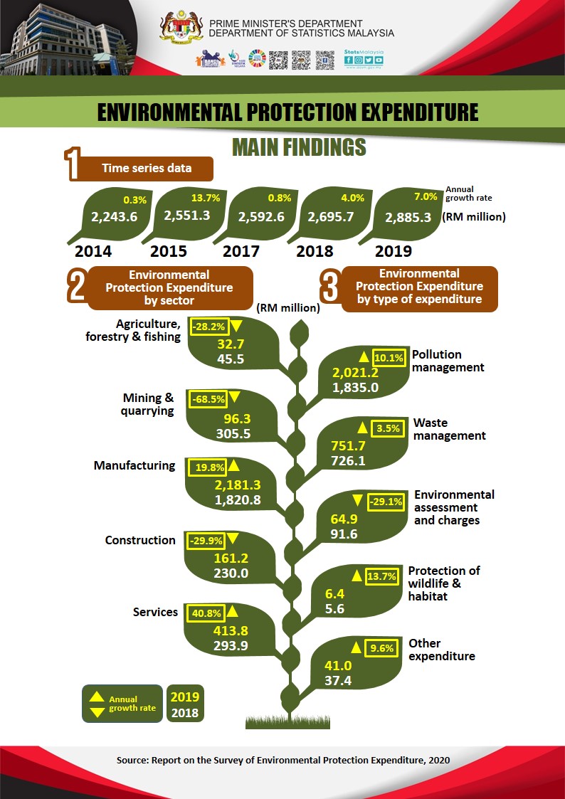 Industry players in Malaysia spent RM2.89 billion for environmental protection expenditure in 2019, 7.0 per cent higher than the amount spent in 2018. Operating expenditure constitutes the largest share at 70.3 per cent, while 29.7 per cent was spent on capital expenditure.