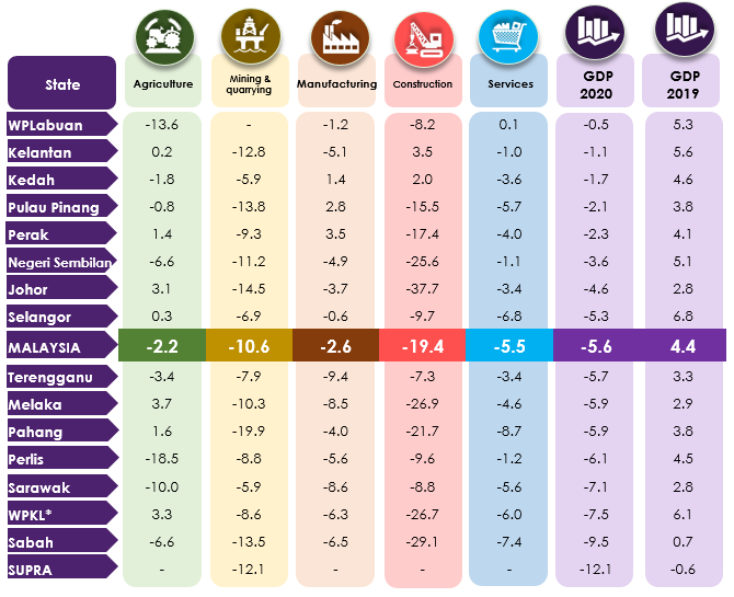 In 2020, Malaysia’s economic performance contracted 5.6 per cent as compared to 4.4 per cent in the preceding year. In general, albeit a negative growth posted by all states, eight states registered better growth magnitude as compared to the 5.6 per cent contraction at the national level. W.P. Labuan recorded a decrease of 0.5 per cent, followed by Kelantan (-1.1%), Kedah (-1.7%), Pulau Pinang (-2.1%), Perak (-2.3%), Negeri Sembilan (-3.6%), Johor (-4.6%) and Selangor (-5.3%). Meanwhile, six states namely Selangor, W.P. Kuala Lumpur, Johor, Sarawak, Pulau Pinang and Sabah remained as the largest contributor to the national GDP with a total contribution of 72.1 per cent (2019: 72.3%).