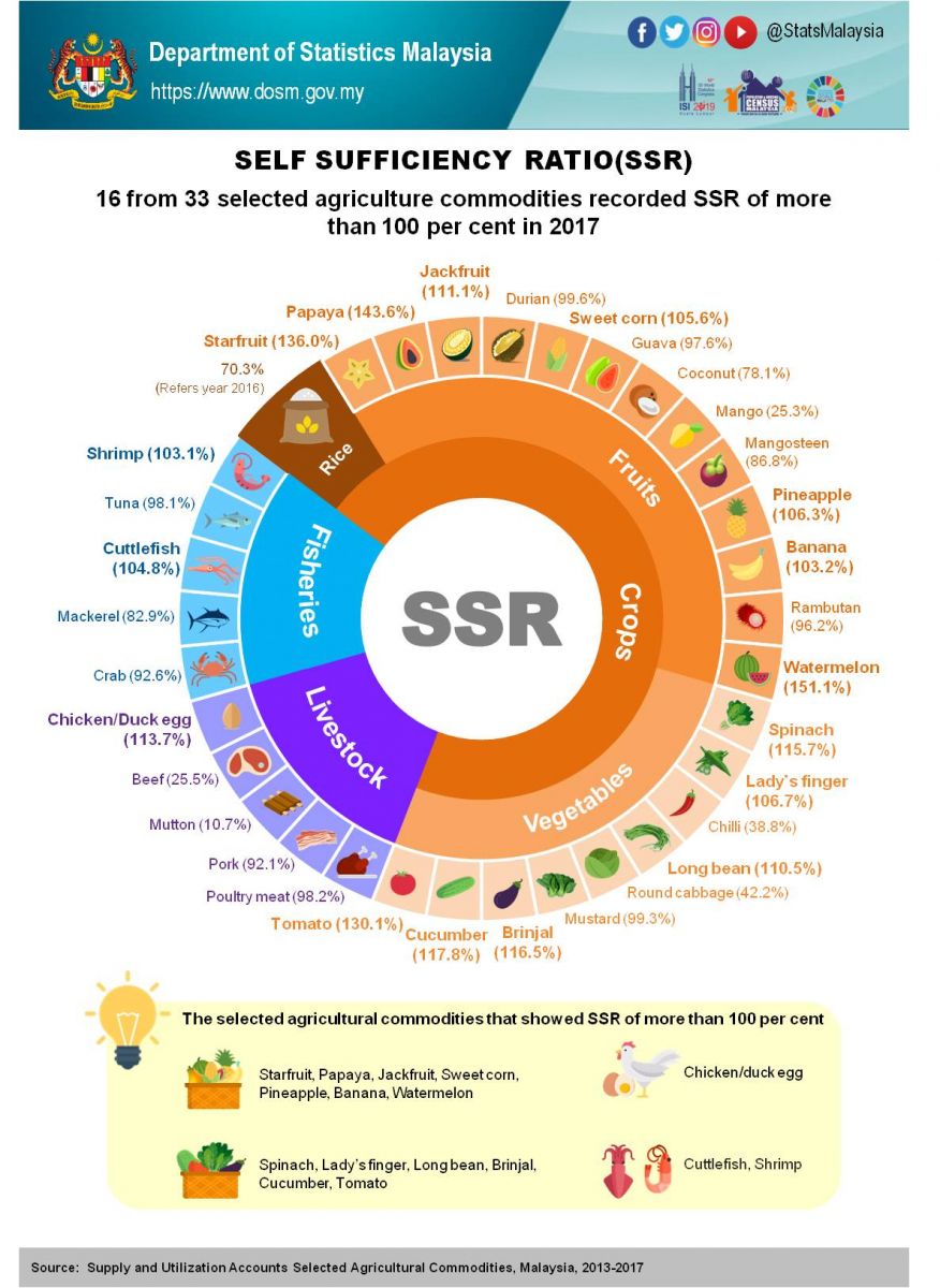 16 from 33 selected agricultural commodities recorded self-sufficiency ratio (SSR) of more than 100 per cent in 2017