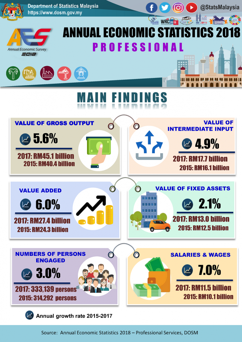 The professional services recorded gross output value of RM45.1 billion in 2017 compared to RM40.4 billion in 2015 with the annual growth rate value of 5.6 per cent per annum. In line with the rapid growth in gross output, the value of intermediate input also increased by RM1.6 billion to record RM17.7 billion with the average annual growth rate of 4.9 per cent, thus resulting a value added of RM27.4 billion for the year 2017. The number of persons engaged in this sector also reported an increase of 3.0 per cent to 333,139 persons as compared to 314,292 persons in 2015. Meanwhile, the salaries & wages paid in 2017 amounted to RM11.5 billion compared to RM10.1 billion in 2015.