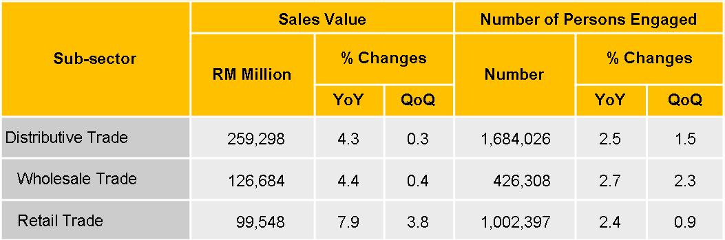 The performance of the Distributive Trade sector increased to 4.3 per cent in first quarter 2016. This increase was propelled by Retail Trade sub-sector (7.9%), Wholesale Trade (4.4%) while Motor Vehicles dropped to –5.5 per cent. On a quarterly basis, sales value showed an increase of 0.3 per cent from RM258.4 billion to RM259.3 billion.