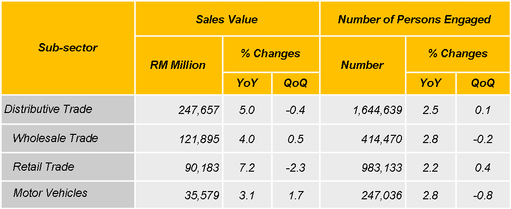 The Distributive Trade sector increased to 5.0 per cent in second quarter 2015. This increase was propelled by Retail Trade sub-sector (7.2%), Wholesale Trade (4.0%) and Motor Vehicles (3.1%). On a quarterly basis, sales value showed a decrease of 0.4 per cent from RM248.6 billion to RM247.7 billion.