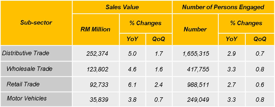 Retail Trade sub-sector recorded an increase of RM5.3 billion or 6.1 per cent as compared to the corresponding quarter of the previous year. On a quarterly basis, sales value of this sub-sector increased by 2.4 per cent.