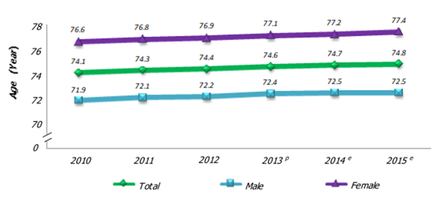 On average, a new-born female is expected to live longer than a new-born male. A new-born female in 2015 is expected to live to 77.4 years and for new-born male to 72.5 years, increased by 0.8 years and 0.6 years respectively as compared to 2010.