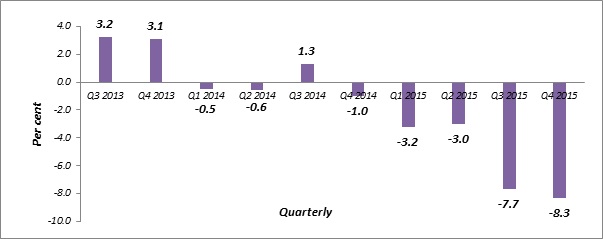 At sectors level, business current situation of industry, wholesale & retail trade and services has deteriorated during the fourth quarter 2015 with a net balance of -8.6 per cent, -25.4 per cent and -1.4 per cent respectively. In contrast, the construction sector has reported a better net balance of +5.0 per cent (Chart IV).