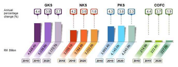 Gross Capital Stock (GKS), which reflects Malaysia's accumulated investments of fixed assets, amounted to RM5.2 trillion with a growth of 2.7 per cent in 2020. Concurrently, Net Capital Stock (NKS) that represents the wealth of Malaysia's economy grew slower by 1.8 per cent with a value of RM3.2 trillion. Productive assets that are measured through Productive Capital Stock (PKS) recorded RM4.2 trillion compared to the previous year RM4.1 trillion. Meanwhile, Consumption of Fixed Capital (COFC) which represents the value of the assets used up in the production process in 2020 posted RM227.0 billion with a growth of 1.9 per cent. The slower growth of GKS, PKS and NKS are the effects of the reduction in investments as a result of the COVID-19 pandemic which has influenced the performance of all economic activities.