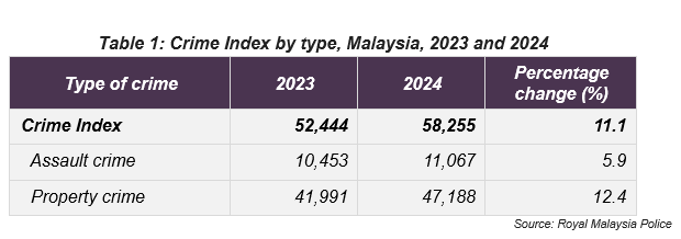 Malaysia’s Crime Index in 2024 rose by 11.1 per cent, with 58,255 cases reported as compared to 52,444 in 2023. This increase was largely driven by property crimes, which surged by 12.4 per cent to 47,188 cases. Assault crimes also saw a modest rise of 5.9 per cent, totaling 11,067 cases.