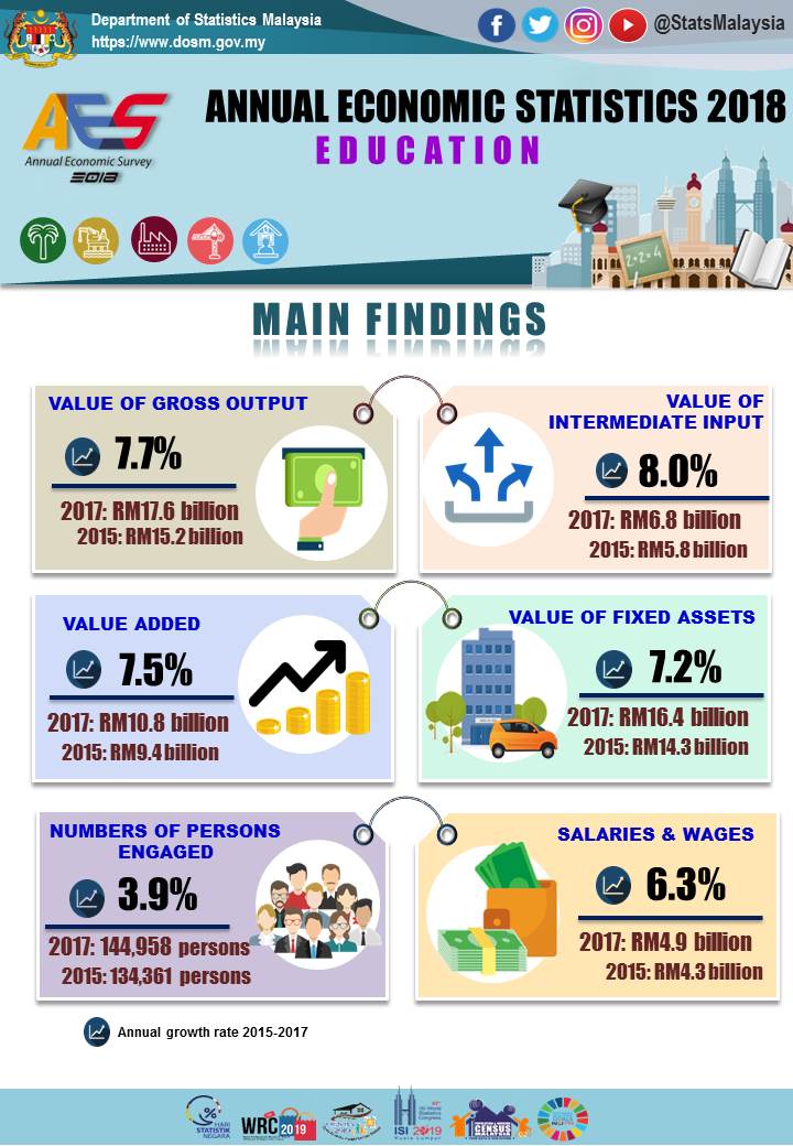 The total value added recorded in education services for 2017 is RM10.8 billion with annual growth rate of 7.5 per cent per annum within the period of two years. College and university education recorded the highest value added in 2017 which amounted to RM6.5 billion (2015: RM5.7 billion). This was followed by the other education of RM1.9 billion (2015: RM1.7 billion) and secondary education of RM1.3 billion (2015: RM1.1 billion).