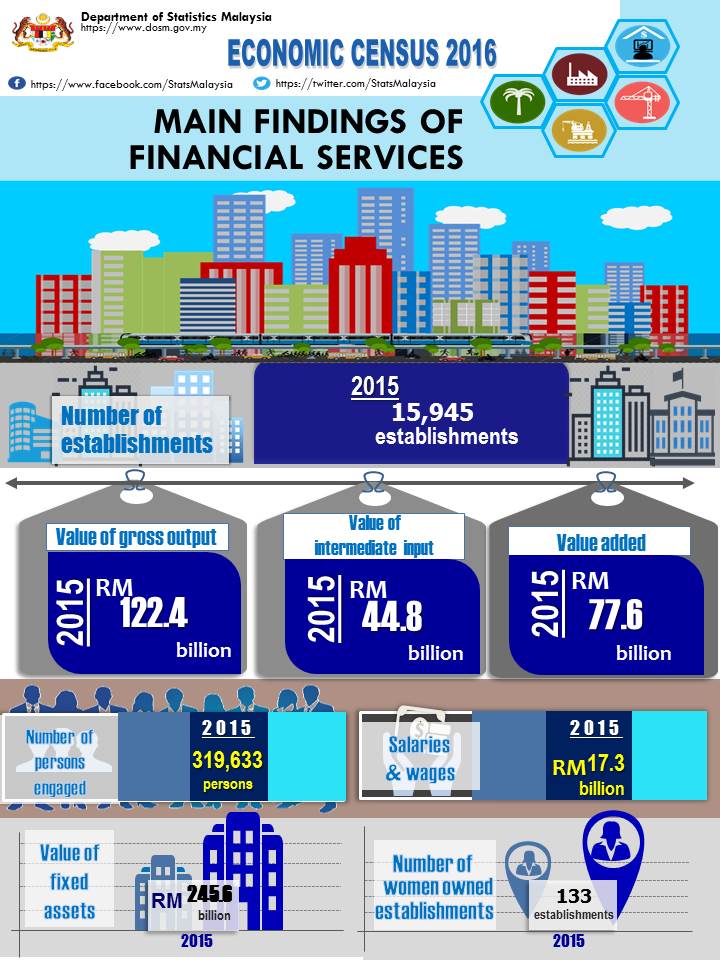 This report presents statistics on the financial services that was compiled based on Economic Census undertaken in 2016 for reference year 2015. Financial services comprises monetary intermediation activities; other financial service activities and activities auxiliary to financial services; insurance/takaful, reinsurance/retakaful and pension & provident funding activities; and activities auxiliary to insurance/takaful and pension funding.