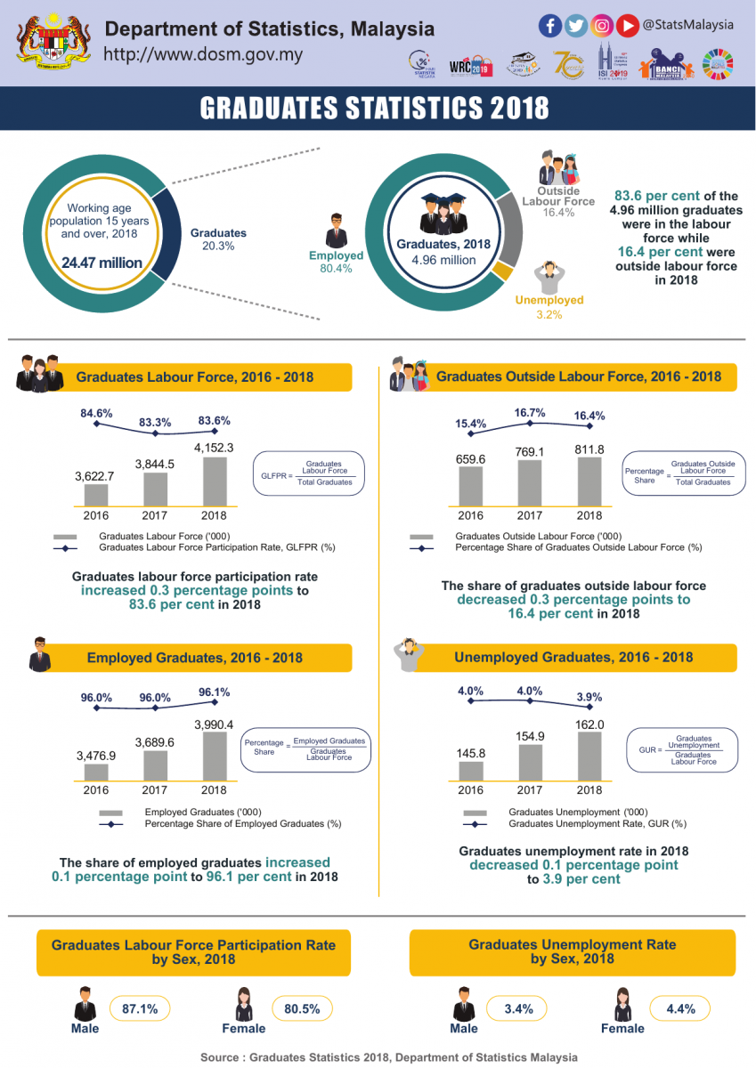 In 2018, number of graduates in Malaysia was 4.96 million persons, increased 7.6 per cent from 4.61 million in 2017. During the same period, graduates labour force increased 8.0 per cent to 4.15 million persons (2017: 3.84 million persons). Graduates labour force participation rate (GLFPR) was 83.6 per cent, went up 0.3 percentage points as against 83.3 per cent in 2017.